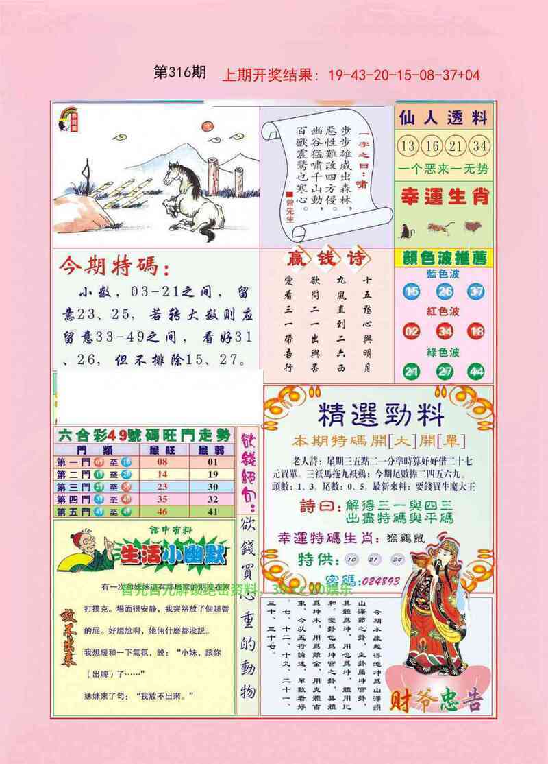 | 316期:单双两肖【双数+鸡牛】开:马24中 |